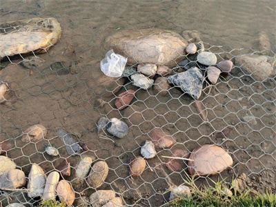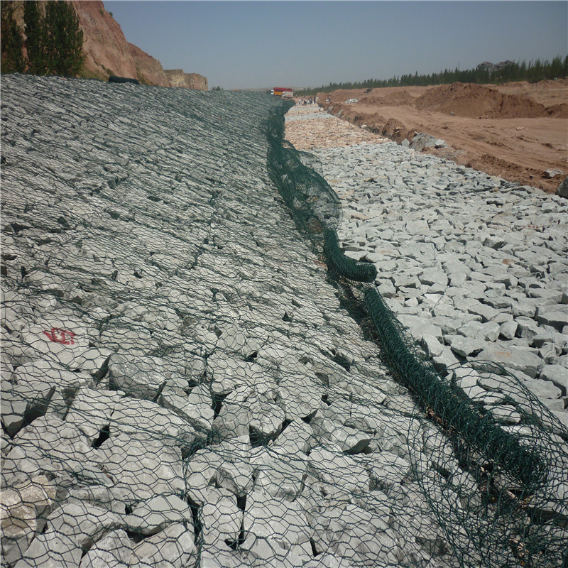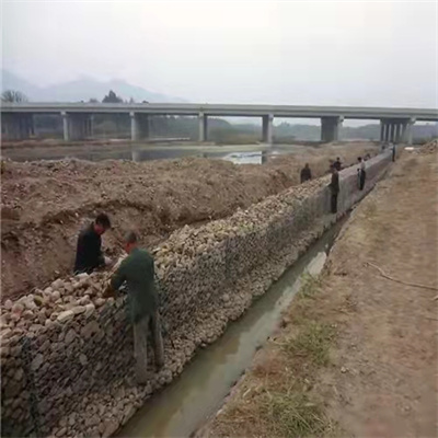 鍍鋅石籠網(wǎng)護(hù)堤是由經(jīng)過鍍鋅處理后的低碳鋼絲使用機(jī)械采用雙絞合編織加工制作形成的一種生態(tài)格網(wǎng)填石結(jié)構(gòu)。該結(jié)構(gòu)可用于邊坡防沖刷保護(hù)、邊坡植生(綠化)、河流改道擋土墻防護(hù)、河道護(hù)堤防護(hù)等。