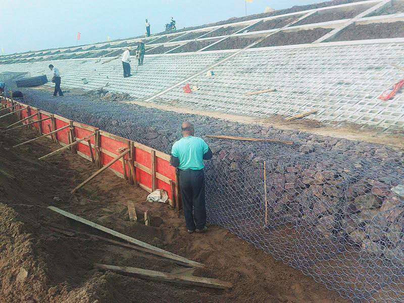 堤壩石籠網(wǎng)是石籠網(wǎng)用于堤壩上一種通俗的叫法,它采用石籠網(wǎng)箱裝石頭的方法鋪設(shè)在堤壩上來保護(hù)堤壩安全。土壩是所有河道、水庫、湖泊等的主體結(jié)構(gòu),然而也有著不盡人意的地方,水浪的拍打、水無孔不入的滲透、洪水的沖擊等都會對土壩形成威脅,石籠網(wǎng)的加入正好彌補(bǔ)了它的不足